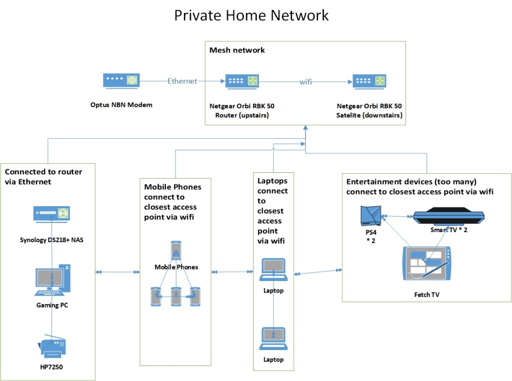 Our family has struggled for many years to obtain good Wi-Fi coverage throughout our two-storey house in Sydney. After much research, we settled on purchasing a Netgear Orbi (router and one satellite node) and set up a home network based on the mesh topology. We also signed up for the fastest speed available from our service provider on the National Broadband Network (NBN).